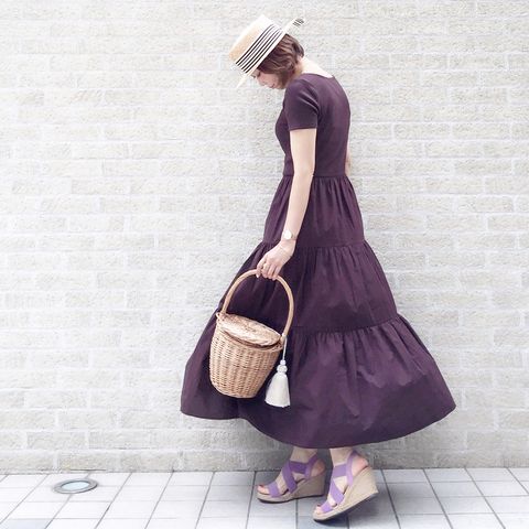 気温の高い日は、1枚でシンプルに着こなすのが正解。ハットやカゴバッグを足すことで、より夏らしい着こなしに仕上がります。ウェッジソールのサンダルを取り入れることで、スタイルアップ効果も。