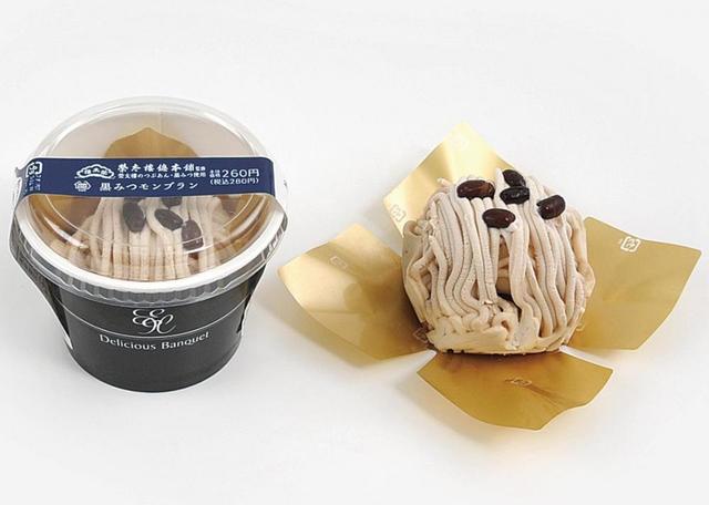 スポンジの上につぶあん、ホイップクリーム、黒みつソースと黒みつクリームを絞り、最後に小豆をのせたモンブランです。価格は280円。