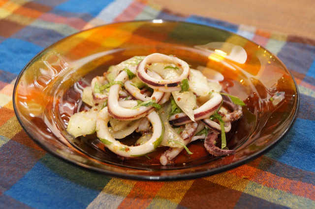 この連載では「10分以内で作れる!簡単おつまみレシピ」をご紹介します!今回はイカとセロリの葉をハニーマスタードで和えた、おつまみサラダ。これからの暑い季節にぴったりなさっぱりとした味わいですよ。ぜひ作ってみてくださいね。
