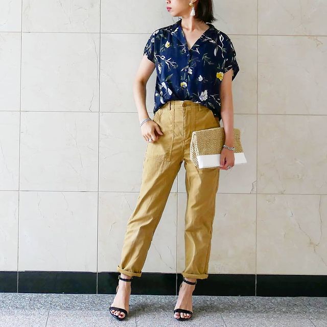 柄ありオープンカラーシャツにカラーボトムスを合わせれば、メリハリがあって目の引く夏コーデに決まります。ネイビーの花柄シャツには、イエローパンツと補色を組み合わせてメリハリあるスタイルに。
