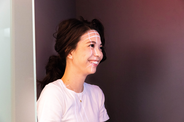 測定が終わり2階へ進むと「スマート ビューティー ウォール」が待っています。美肌に必要な5つの項目(キメ、ハリ、シワ、シミ・くすみ、ツヤ)に分かれていて、それぞれのパネルの前に立つと顔認証システムでわたしを認識し、結果が自動的に表示されるんです!