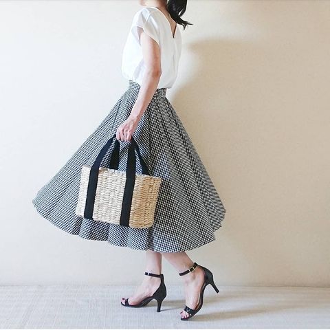 タック部分を後ろにすると、うなじがちらりと見えてほんのり色っぽい着こなしに。ギンガムチェックのスカートを合わせるのもおすすめです。モノトーンコーデでも軽やかさのある着こなしに仕上がっています。
