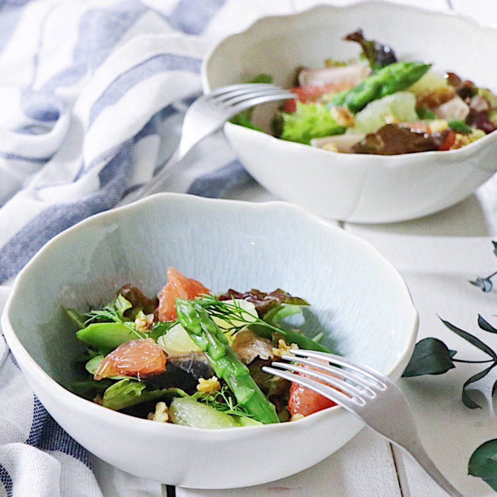 5. 器に③を盛り、グレープフルーツの果肉、②のアスパラガス、生ハム、クルミ、ディルをトッピングし、④をかけて召し上がれ♪