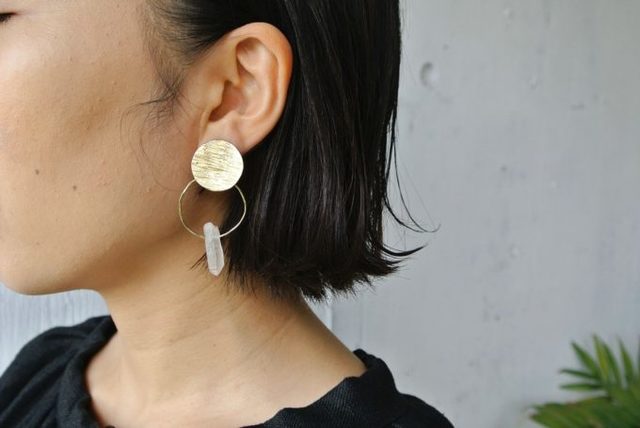 また、ピアスもイヤリングも、フープとクオーツを取り外して、丸い真鍮の飾りだけのシンプルなイヤーアクセサリーとしても使える2way仕様になっています。気分や服装に合わせて楽しんでください。
