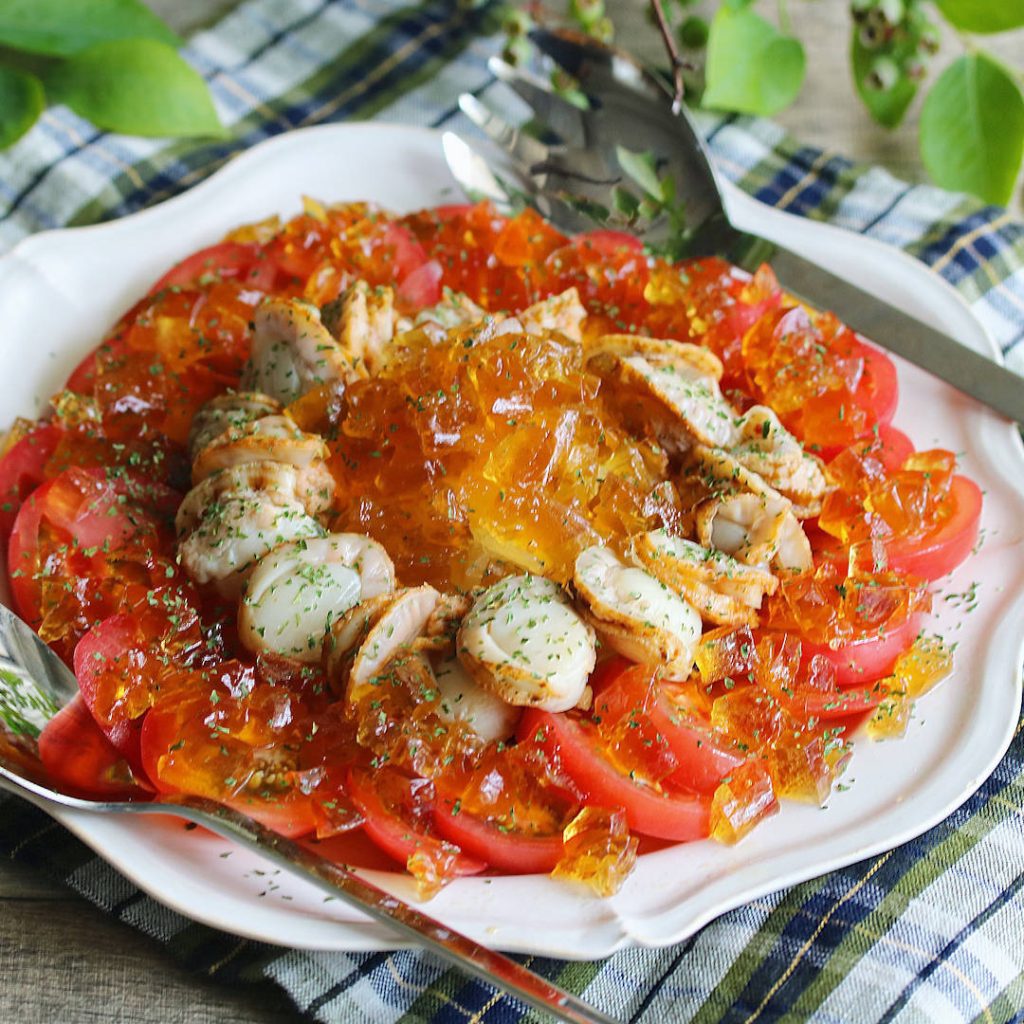 「トマトとホタテのきらきらジュレサラダ」のレシピと作り方を動画でご紹介します。フレッシュなトマトとホタテのサラダに、ゼラチンで固めたキラキラのポン酢ジュレをたっぷりとかけました。簡単なのにおしゃれさ抜群!おもてなしにぴったりのひと品です。