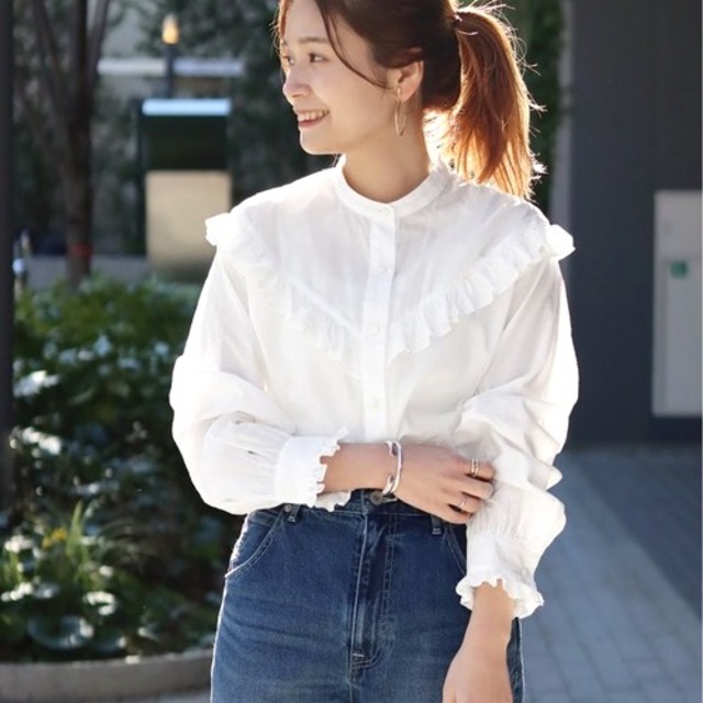 アクセいらずで胸元をおしゃれに盛れるブラウスです。さらりとした落ち感のある生地なので、ウエストインスタイルで着こなすのがおすすめです。全4色展開です。