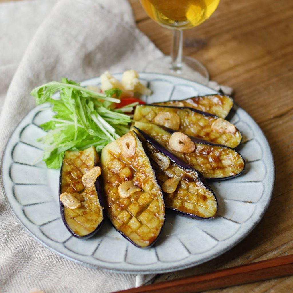 1. なすはヘタを切り落とし、縦半分に切って断面に格子状に切り込みを入れます。
