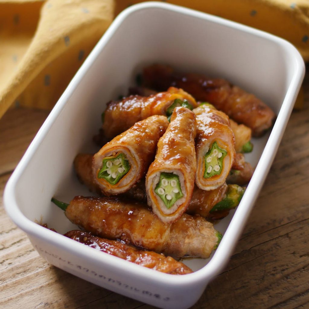 「にんじんとオクラのカラフル肉巻き」のレシピと作り方を動画でご紹介。薄切りにしたにんじんとオクラを豚ロース肉で巻き、にんにくが香る甘辛いタレを絡めました。切った断面からのぞくオクラの星型と色味が、とてもかわいらしい作り置きおかずです!