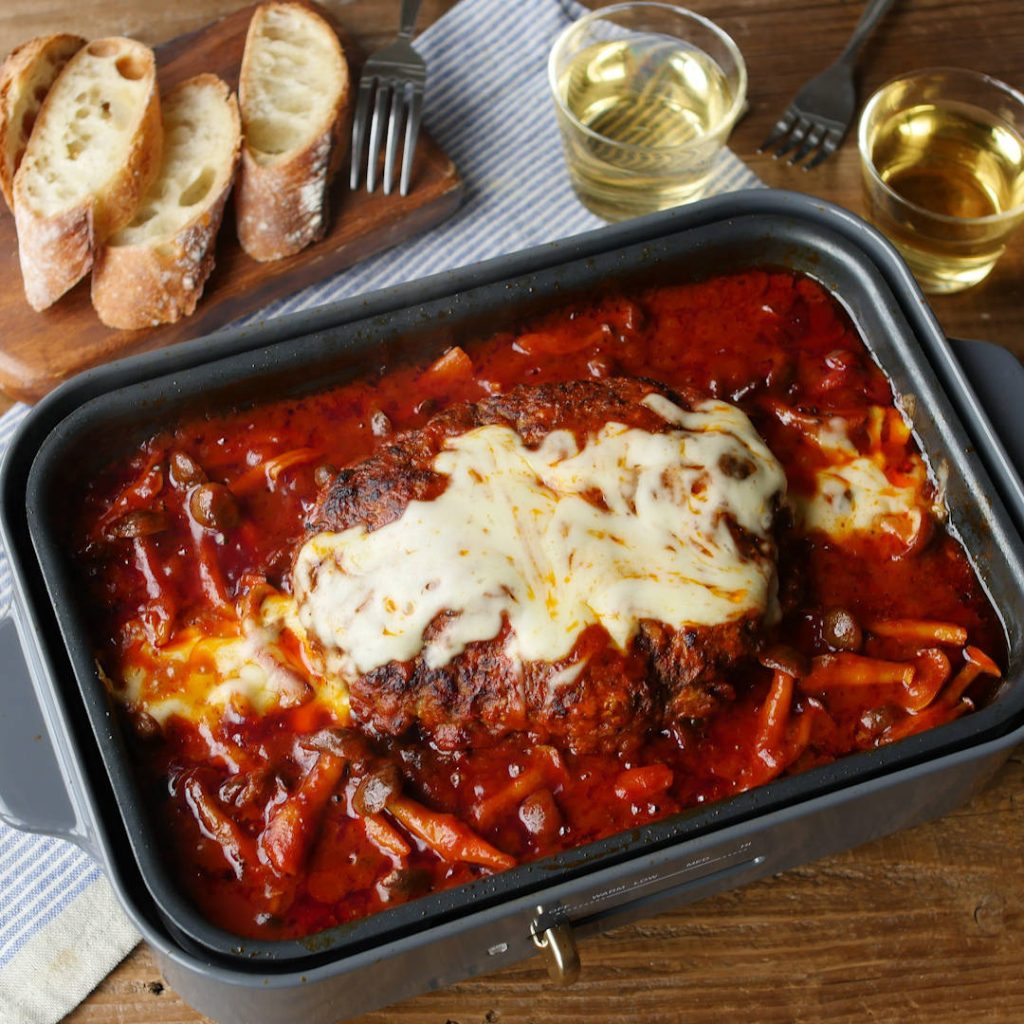 「トマト煮込みビッグハンバーグ」のレシピと作り方を動画でご紹介。ホットプレートでハンバーグを焼き、そのままトマトソースで煮込みました。みんなでわいわい食べたい、特大サイズのハンバーグです。とろけるチーズをたっぷり絡めて召し上がれ!