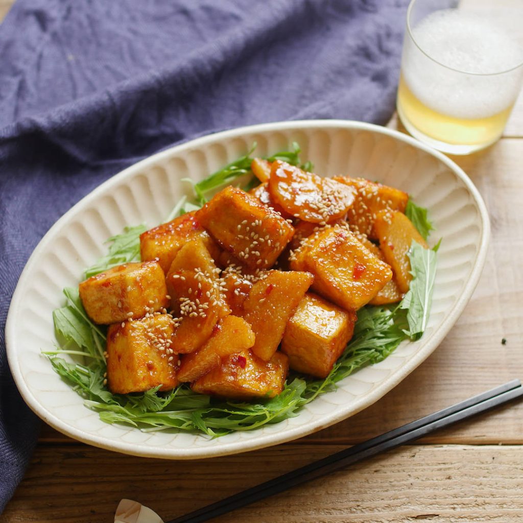 「ヤンニョム豆腐」のレシピと作り方を動画でご紹介。豆腐と半月切りした長芋を韓国風の味付けで炒めました。コチュジャンの旨辛い風味がクセになるひと品です。ヤンニョムチキンよりも手軽に作れるので、おつまみやおかずなどにぜひ活用してみてくださいね。