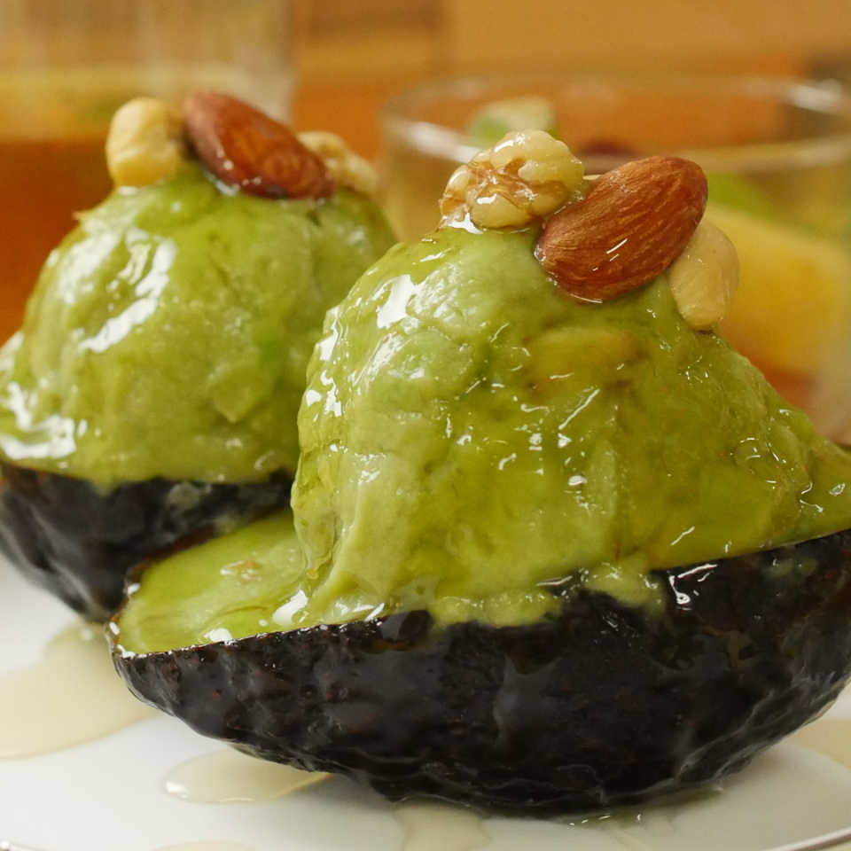 くり抜いたアボカドの皮は、内側の果肉をスプーンで完全にこそぎとり、よく洗って水気を拭いて冷蔵庫で冷やしておくと、盛り付けの器として使うことができます。アボカドアイスを一度冷凍庫から取り出して、空気を含ませるようによく混ぜることでなめらかな食感になりますよ♪