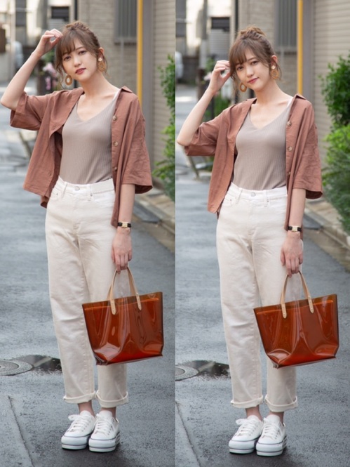 骨格ウェーブさんが着るとぼんやりしてしまいがちなオールホワイトコーデですが、ベージュのリネン混ノーカラージャケットを肩掛けしてこなれポイントにすることで骨格ウェーブさんに似合うランクアップした春の着こなしを作ることができていますね。