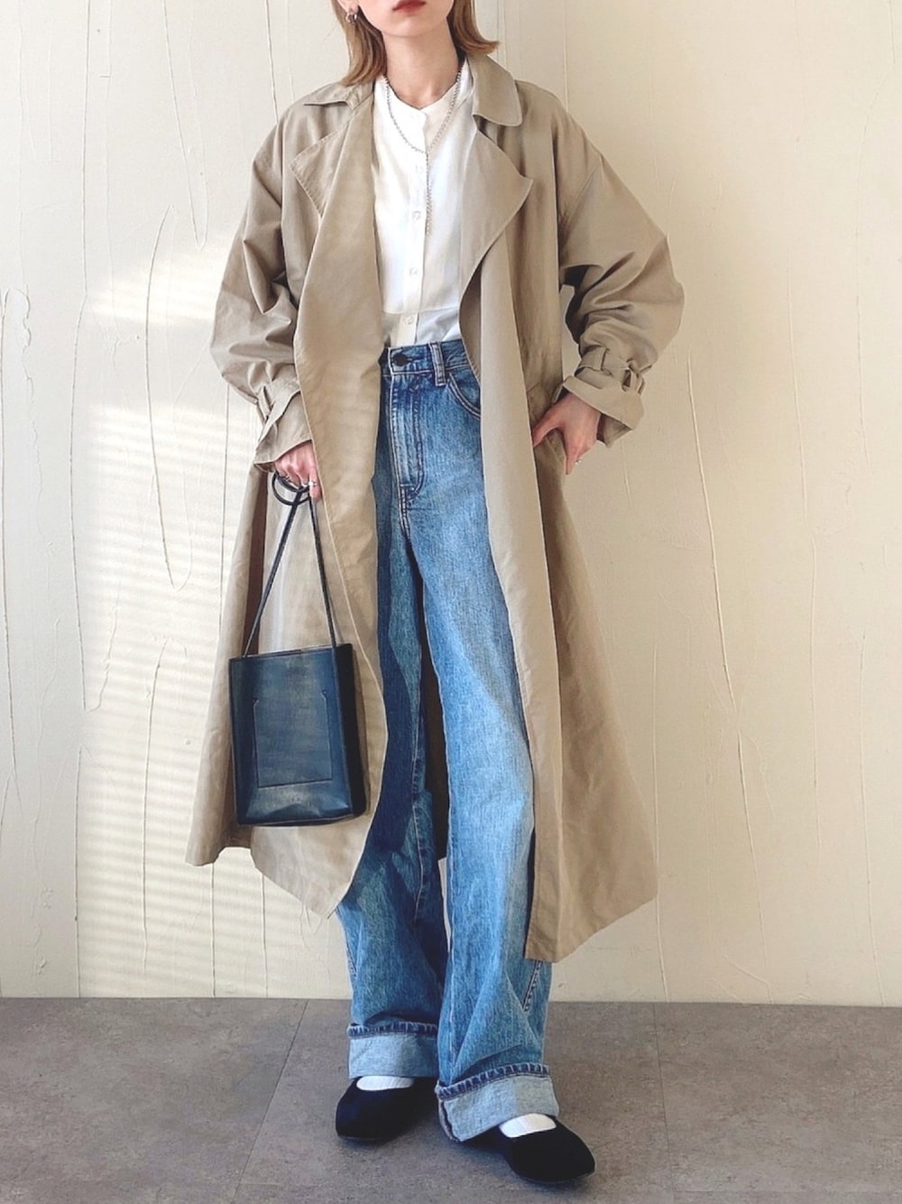 おすすめは、オーバーサイズ気味のロングトレンチコートに、白シャツとデニムを合わせたコーデ!