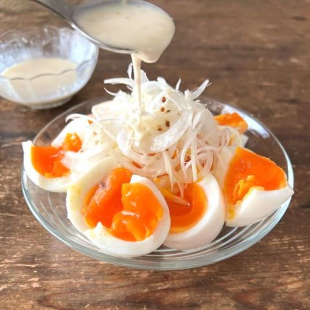 いかを一杯使用した、食べ応えのある絶品おつまみ。作り方はいたって簡単で、茹でたいかに千切りした玉ねぎをトッピングし、あとはマヨネーズ&ポン酢をかけるだけ。お好みで七味唐辛子をかけても美味しいですよ。
