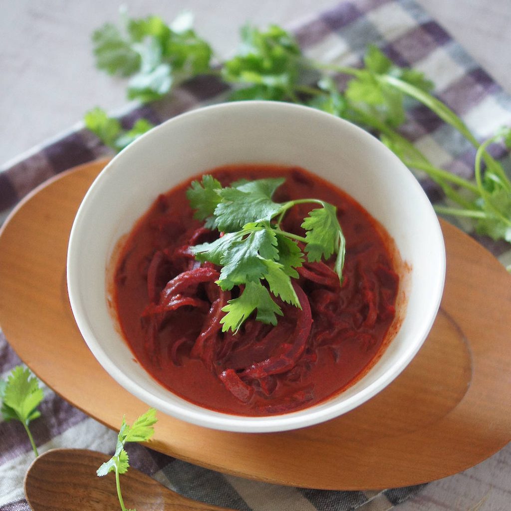 「ビーツヌードルカリー」のレシピと作り方を動画でご紹介します。OXOのベジヌードルカッターを使ってビーツをヌードル状にカットし、スパイスの効いたココナッツカレー味に仕上げました。ナンといっしょに食べるのもおすすめです。