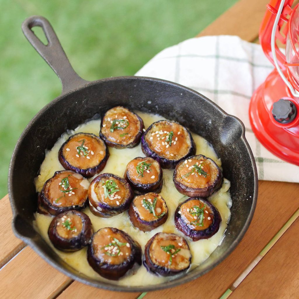 「なすみそ田楽」のレシピと作り方を動画でご紹介。なすに田楽みそを塗り、とろけるチーズといっしょにスキレットで焼きました。みそとチーズの旨味で、しっとり香ばしいおいしさに!ジューシーななすを存分に味わえる、アウトドアにもおすすめのひと品です。