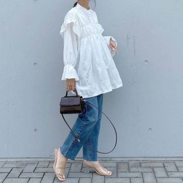 タンクトップに白シャツを羽織り、サンダルを合わせたリラクシーなカジュアルコーデも。モノトーンやブルーなど落ち着いたカラーでまとめて、上品にまとまっています。