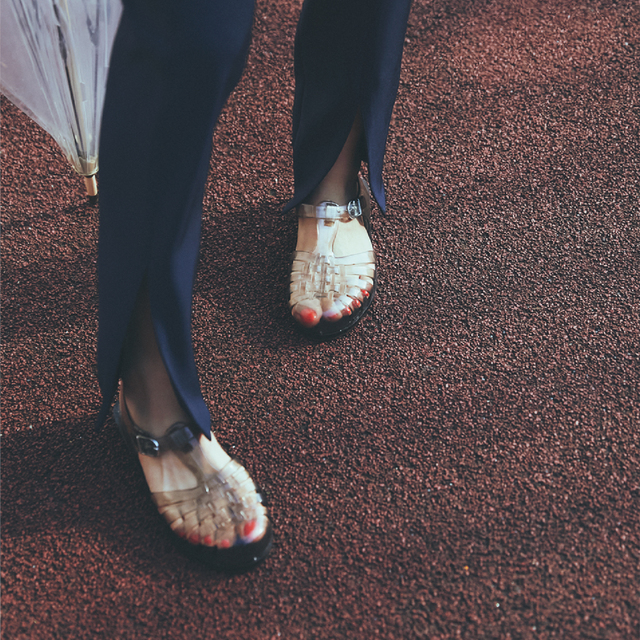 黒ならかっちりとした印象で、どんなアイテムにも合います。バケットハットにビーサンを合わせれば、モノトーンでクールな夏カジュアルスタイルの完成です。