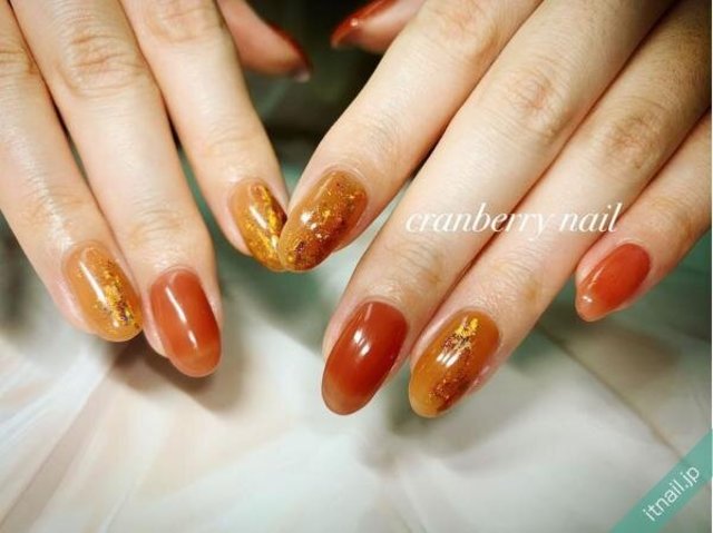鮮やかな朱色にかけ合わせた透明感たっぷりなタイダイネイル。自爪が透けるクリアなベースにさりげなく漂うレッドとブルーがオシャレです。ゴールドの箔も奥行きを感じさせるハイセンスな演出。