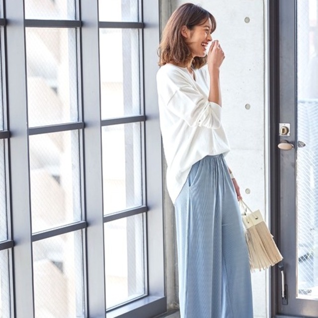 パンツスタイルの時は、華奢なデザインのサンダルやかご素材のバッグで抜け感をプラスするのがポイントです。