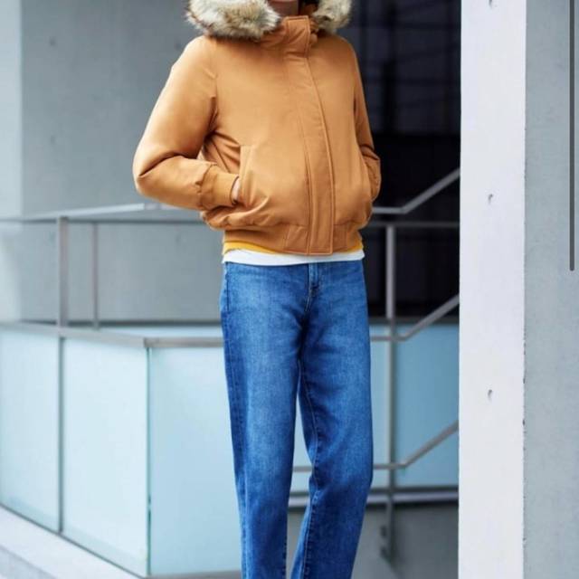 ざっくりとしたシルエットのブラウントップスにタイトなデニムパンツを合わせた、こなれ感たっぷりなコーディネート。