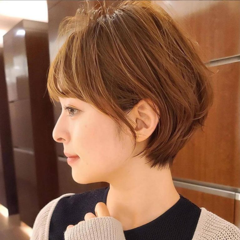 ぱつっと切りそろえた顎ラインのミニボブに、明るめカラーで遊び心をプラス。重たくなりがちな秋冬ファッションには、これくらい明るい髪色も断然ありです。
