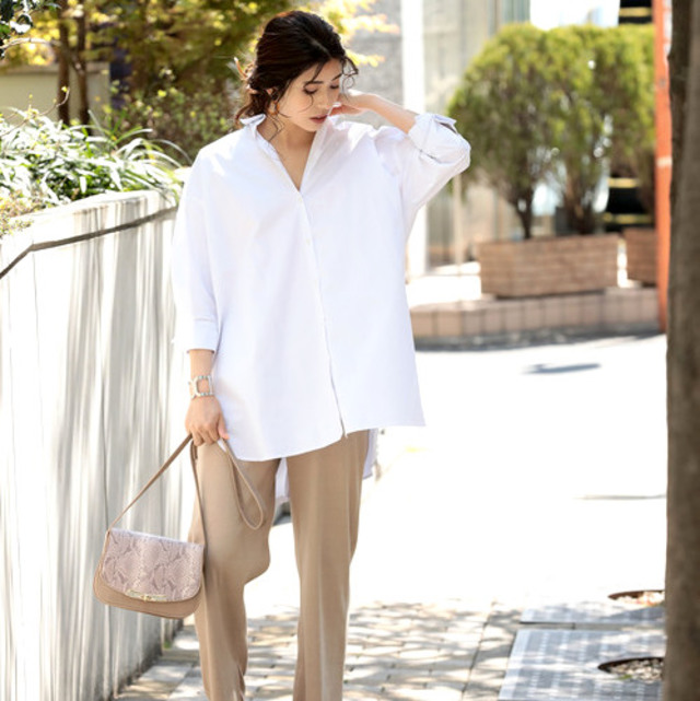 シャリ感のある生地で作られたボリューミーなシャツは、シンプルにデニムと合わせて。アイボリーの他にブラウンもあります。プチプラだからイロチ買いもできますね。