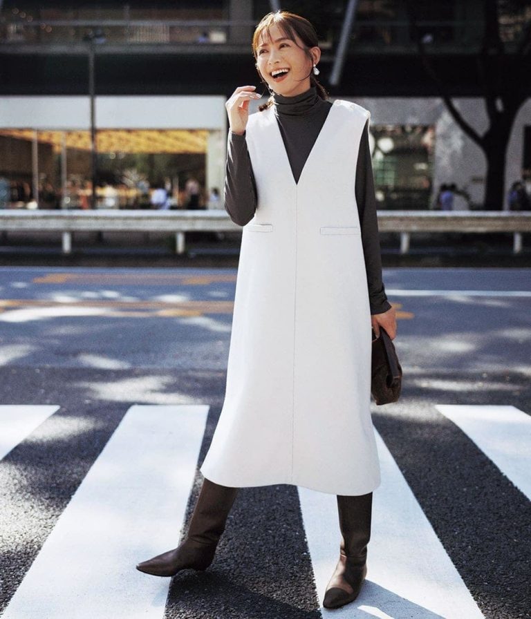 秋色グリーンにまず目を奪われるこちらのワンピース、実はレイヤードベストが取り外し可能!ボタンを外せば羽織にもなり、ニットベストを重ねたりと、とにかくアレンジがきくのも魅力です。
