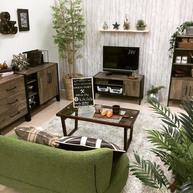 立体的に飾られたグリーンが目を惹くみずみずしい空間。厳選して置かれている家具や雑貨は、DIYも交えながらよりフィット感を大切に配置されています。アートやファッション小物、洋服を組み合わせたディスプレイもこだわりが感じられますね。