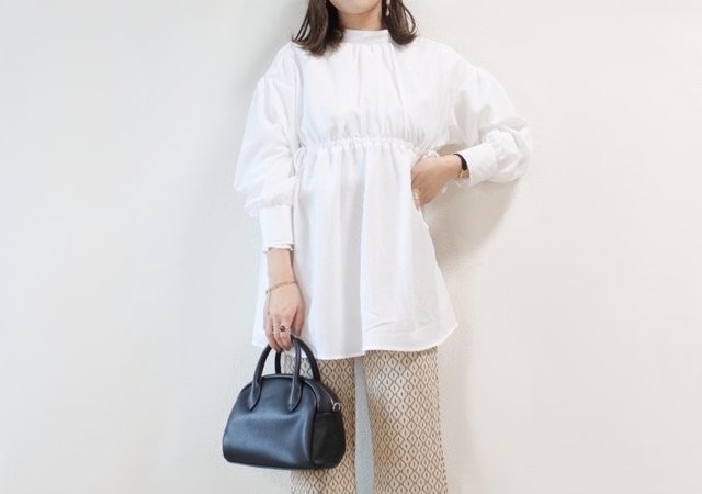やわらかい素材なので、ウエストINしてもかさばらずスッキリ。サイドスリットでINもしやすく、後ろだけ裾出しするとこなれ感もアップします。スウェットパンツのセットアップでも、今年らしいデザインで部屋着っぽく見えません。