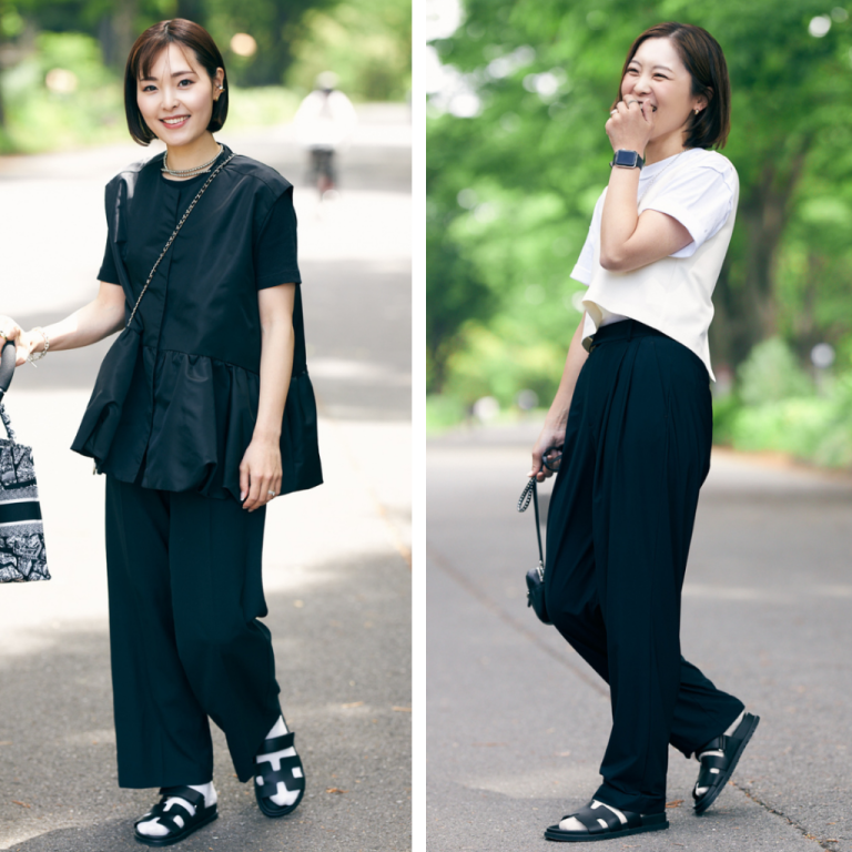 リブ素材の黒トップスに、白シャツをドッキングしたチュニック。レイヤード風の着こなしで今年らしさが出るだけでなく、ゆるめのシルエットで体型カバー効果も◎