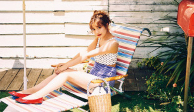 白のGUシャツワンピースに、上半身をコンパクトに演出するビンクブラウンのクロップド丈のニットがセットになったコーディネートです。