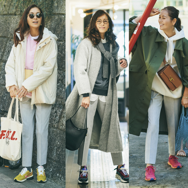 キャンバス地のトートバッグやスニーカーで程よくカジュアルダウンして、リラックスした雰囲気に。