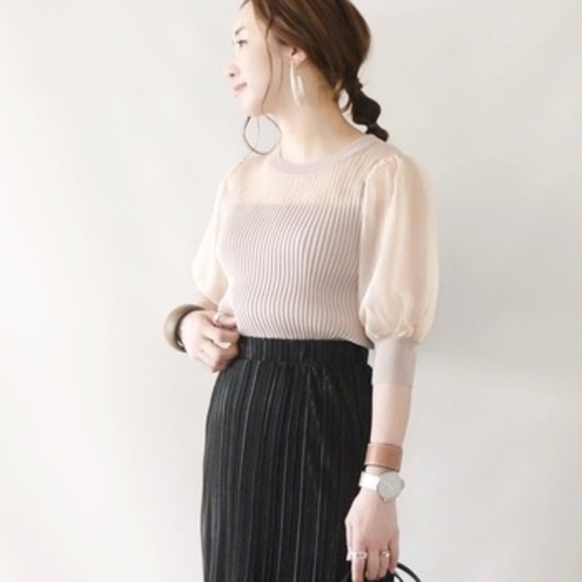 ニットトップスをインナーにして着こなすことで、大人可愛いガーリーコーデに。