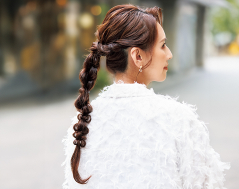 ④残りをフィッシュボーンにし、毛先は丸めて結ぶ。