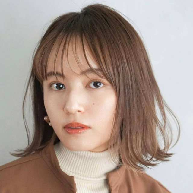鮮やかながら彩度は暗めなのでベースの暗めグレージュとなじんで、シンプルなミディアムヘアがおしゃれに仕上がります。