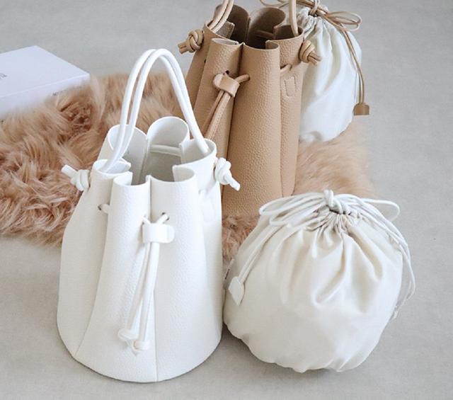 バッグの1つ目は、カヌレのようなシルエットが特徴的な「バケツ型巾着付きバッグ」(1969円)。コード使いが今っぽく、デザインのポイントになっています。