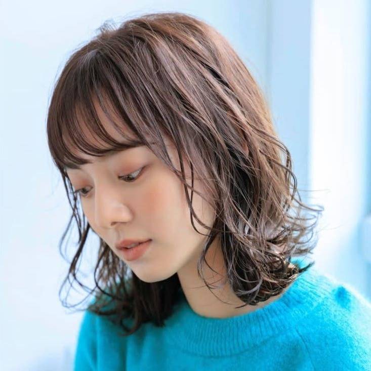 ゆったりしたウェーブ感がポイントのミディアムスタイルです。長めに作った前髪は、かきあげにしたりセンター分けにしたりとアレンジ自由自在。透明感のあるダークカラーも魅力的です。