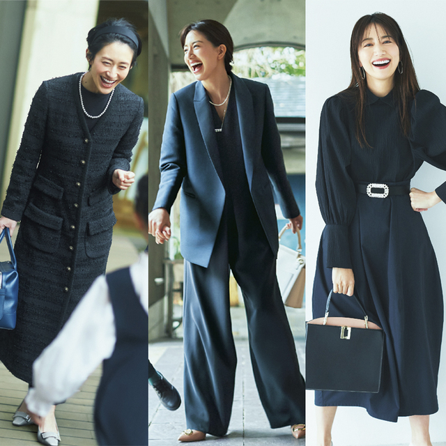 心地良い緊張感を楽しめるセットアップこそ色にこだわってマジメすぎない洒脱な雰囲気作りを。イチオシは黒紺の中で引き立つ〝たまご色〟。品の良い女性らしさはもちろん、ほのかなモード感が、すでに市民権を得ているペールカラーやベージュよりも半歩先の印象に。シャープな印象のテーラードのインナーこそふんわりとした立体感が華やかなボウタイを効かせてハレの日らしい高揚感を。