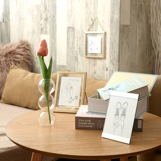 六角形の木枠に試験管がついた、ユニークな一輪挿し。花やドライフラワーを飾るだけでなく、アロマオイルを入れてディフューザーとしても使えます。壁掛け&置き型の2ウェイタイプなので、いろいろな飾り方ができますよ。