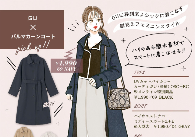 こんにちは!おしゃれ大好き♪イラストレーターの田口ヒロミです。今回はGUオンラインストアですでに色欠けサイズ欠けも出ている大人気アウター、「バルマカーンコート」を使って、オフィスでもOKな細見えフェミニンコーデをご紹介します。
