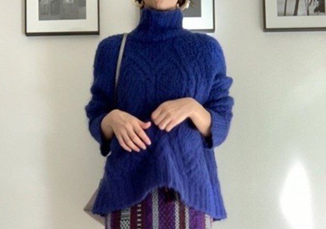 シアーな質感のニットなら、軽やかで春らしく着こなせます。こちらはボートネックでゆったりとしたトップスと、プリーツ風で揺らめくピンタックスカート。深みのあるネイビーも、シアーな素材でほどよい抜け感があります。