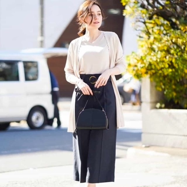 上下をワントーンでまとめたキレイめカジュアル。アンクル丈のテーパードパンツなら女性らしいだけでなく、スニーカーとも相性がいいので悩まずスタイリングできますよ。ゆるニットがラフに見え過ぎないように、アクセサリーをプラスするのもオススメです。