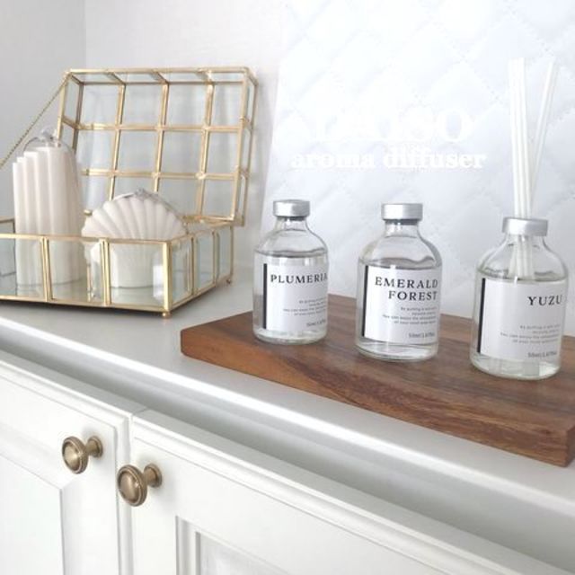 こちらは香水やルームフレグランスなど、香りのコレクションをディスプレイ。ボトルデザインがおしゃれな香水は、しまっておくのがもったいないですよね。ぜひお気に入りのアイテムを飾って、部屋もおしゃれに見せましょう。