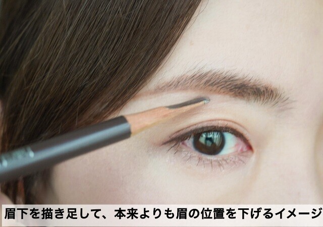 目尻側に斜め上で濃い色を使うことでタレ目の印象が和らぎます。