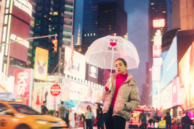 ショッピングや街中散策はトレンドを詰め込んだコーデで。服が淡色だから鮮やかグリーンもグッと映える。