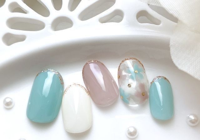 水色のワンカラ―にホワイトで傘を描いたネイルは、大人可愛い印象ですよね。その上にクリアジェルを垂らして、雨粒のようなアートにしましょう。中指と小指も水色ベース×水滴アートにして、梅雨らしさを意識します。人差し指と薬指は、ネイビーベース×ホワイトの雲で青空を描きましょう。「雨が降ったから傘でお出かけ♡でも途中で雨がやんで青空が広がった」といったストーリーが思い浮かびます。