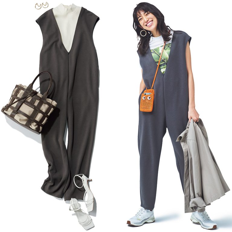 クロップド丈のゆるTシャツとノースリーブワンピースのレイヤードアイテム。Tシャツの丈が短いのが今年らしいポイント。ワンピはクルーネックとVネックの前後2WAYでも着られます。