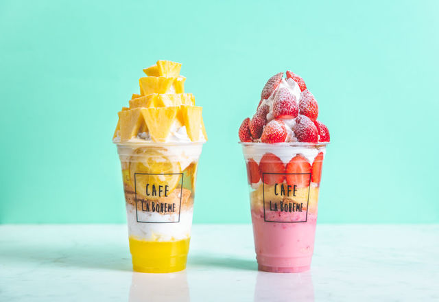マンゴーシロップ漬け、さくらんぼシロップ漬け、抹茶わらび餅、自家炊き粒餡、塩豆(赤えんどう豆)と、彩り豊かな素材に、抹茶風味ホイップクリームを合わせた商品です。