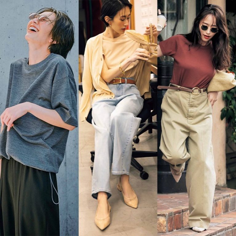 「羽織できちんと感+ワントーン」で通勤映え! 通勤に使うなら、ロゴは立たせるより馴染ませるのが正解。白、黒、紺などのロゴTに同色のキレイめ羽織りを合わせたら、今どきのオフィスにぴったりなカジュアルコーデが完成!
